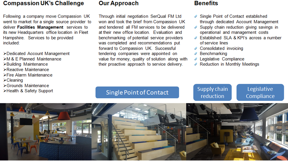 | Following a company move Compassion UK went to market for a single source provider to deliver Facilities Management services to its new Headquarters office location in Fleet Hampshire. |